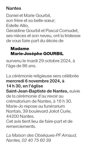 Cet espace « condoléances » est dédié à la mémoire de Madame Marie Josèphe GOURBIL.