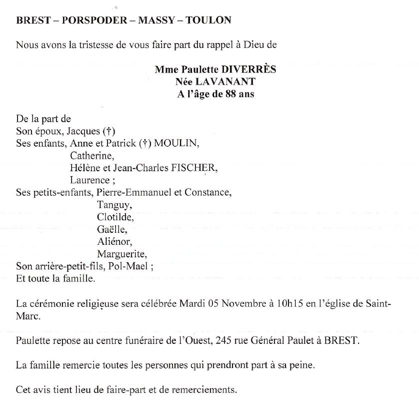 de Madame Paulette DIVERRÈS née LAVANANT