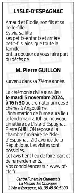 Cet espace « condoléances » est dédié à la mémoire de Monsieur Pierre GUILLON.