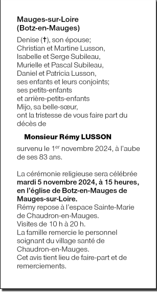 Cet espace « condoléances » est dédié à la mémoire de Monsieur Rémy LUSSON.