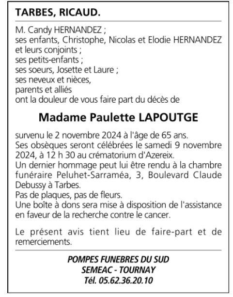 Cet espace « condoléances » est dédié à la mémoire de Madame Paulette LAPOUTGE.