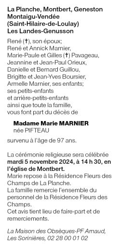 Cet espace « condoléances » est dédié à la mémoire de Madame Marie MARNIER née PIFTEAU.