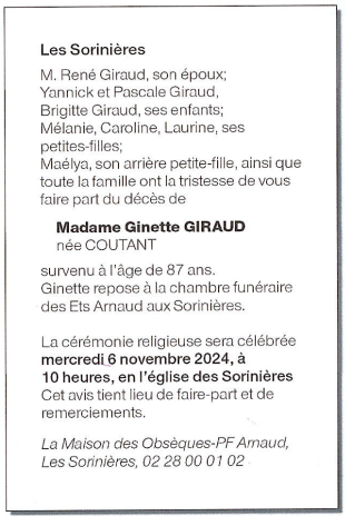 de Madame Ginette GIRAUD née COUTANT