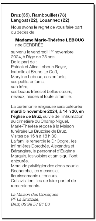 de Madame Marie-Thérèse LEBOUC née DERBRÉE