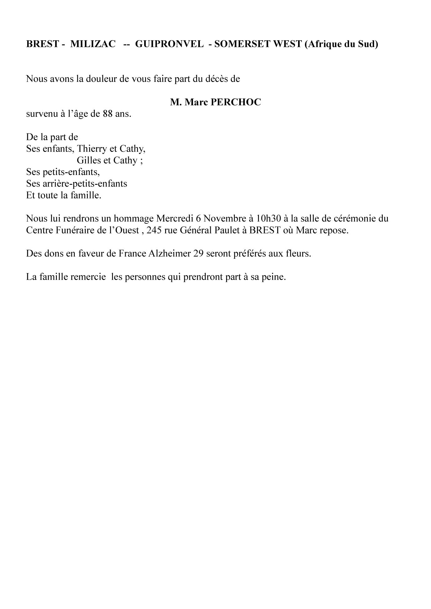 Cet espace « condoléances » est dédié à la mémoire de Monsieur Marc PERCHOC.