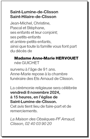 Cet espace « condoléances » est dédié à la mémoire de Madame Anne HERVOUET née GUICHET.