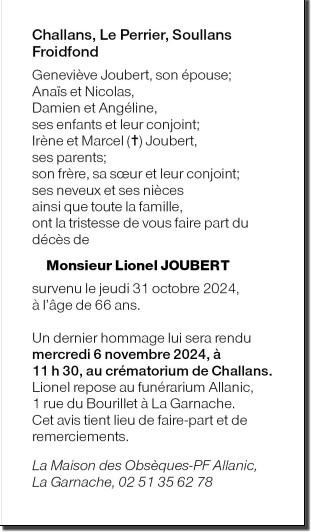 Cet espace « condoléances » est dédié à la mémoire de Monsieur Lionel JOUBERT.