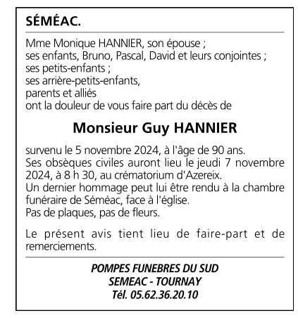Cet espace « condoléances » est dédié à la mémoire de Monsieur Guy HANNIER.