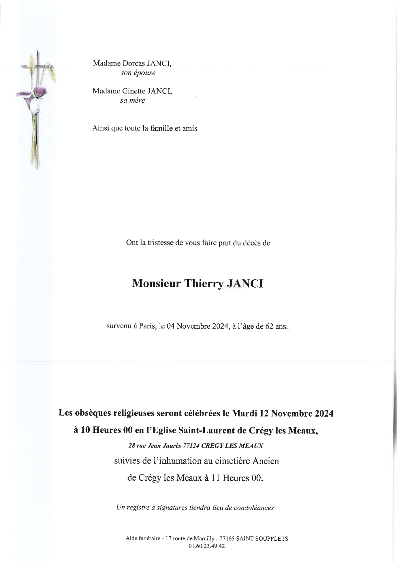 Cet espace « condoléances » est dédié à la mémoire de Monsieur Thierry JANCI.