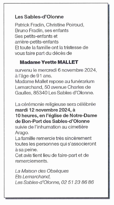 de Madame Yvette MALLET