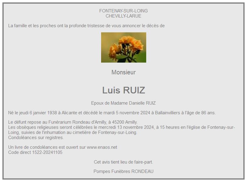 Cet espace « condoléances » est dédié à la mémoire de Monsieur Luis RUIZ.