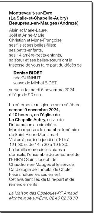 de Madame Denise BIDET née GUINHUT