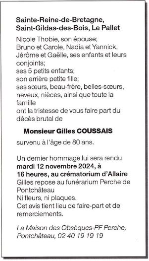 Cet espace « condoléances » est dédié à la mémoire de Monsieur Gilles COUSSAIS.