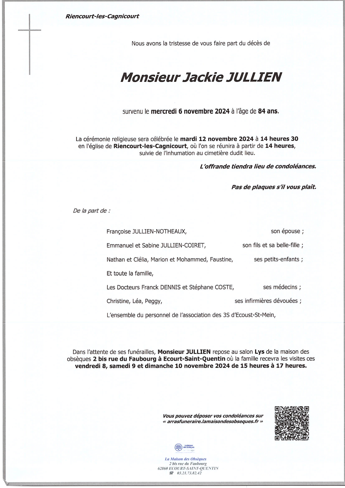 Décédé à Riencourt-lès-Cagnicourt (62182) le mercredi 6 novembre 2024