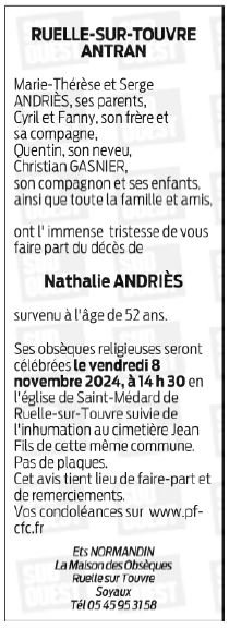 Cet espace « condoléances » est dédié à la mémoire de Madame Nathalie ANDRIÈS.