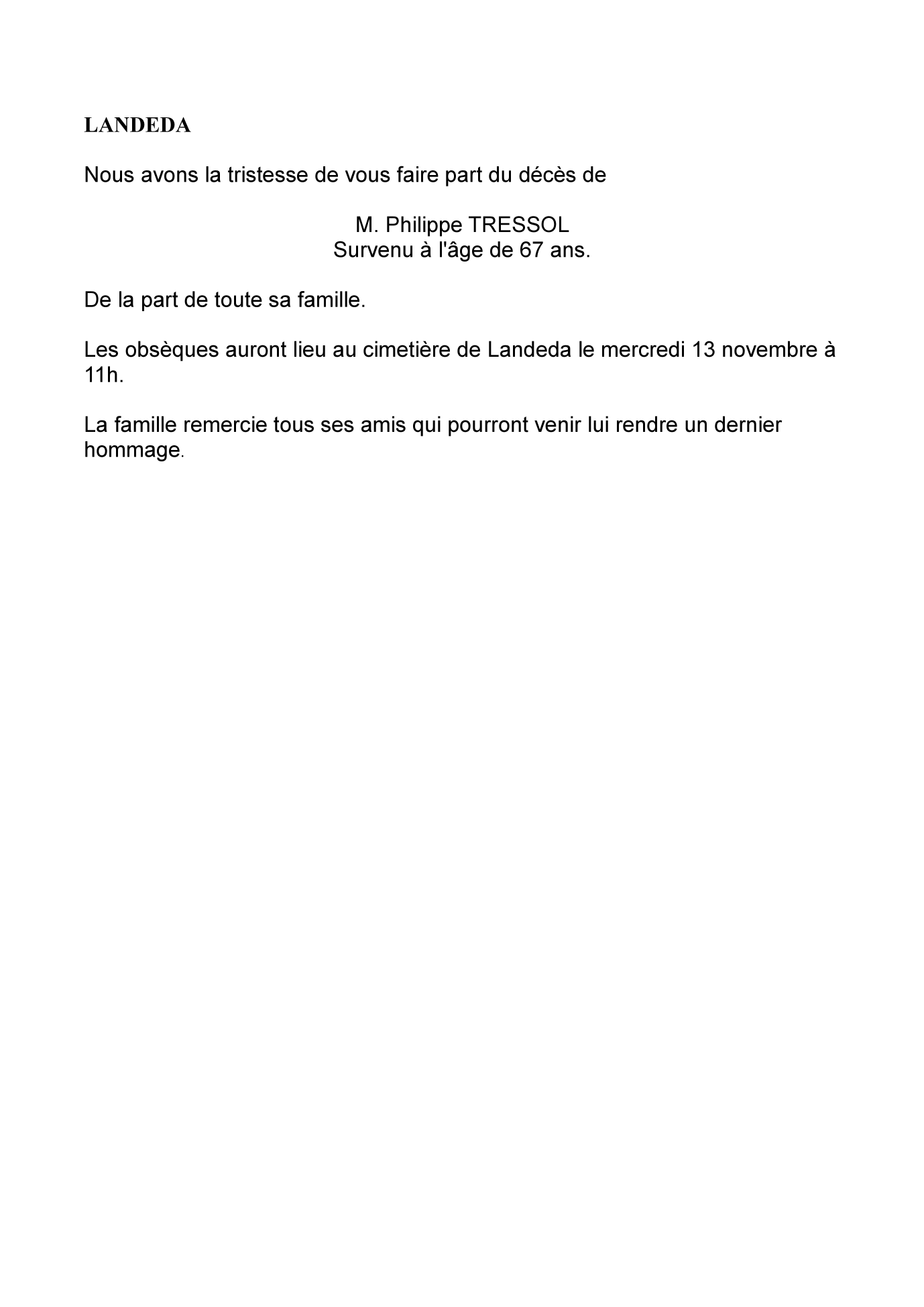 Cet espace « condoléances » est dédié à la mémoire de Monsieur Philippe TRESSOL.
