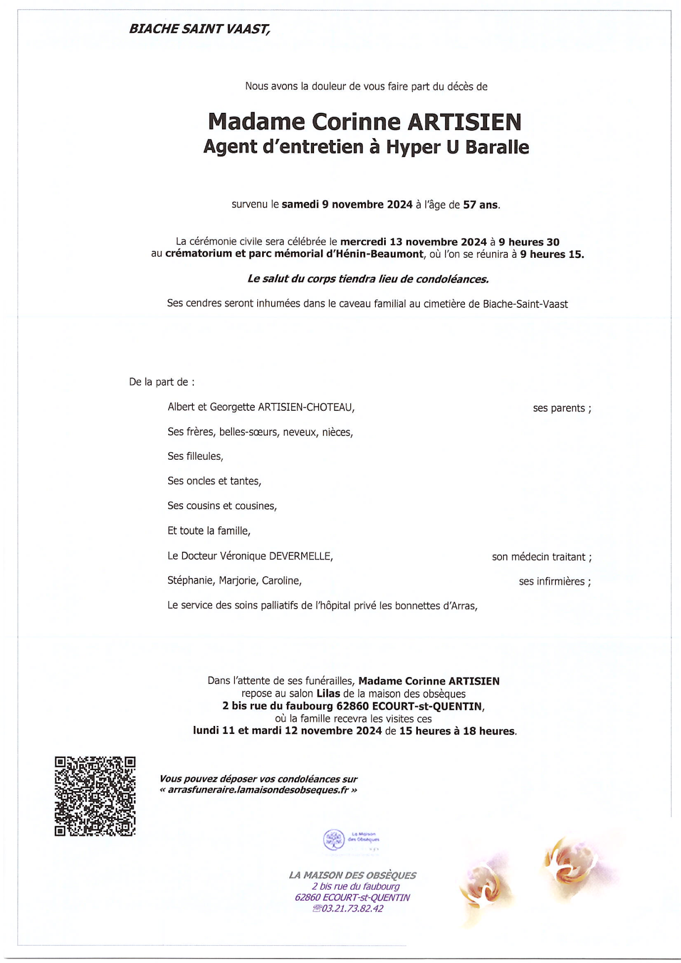 Cet espace « condoléances » est dédié à la mémoire de Madame Corinne ARTISIEN.