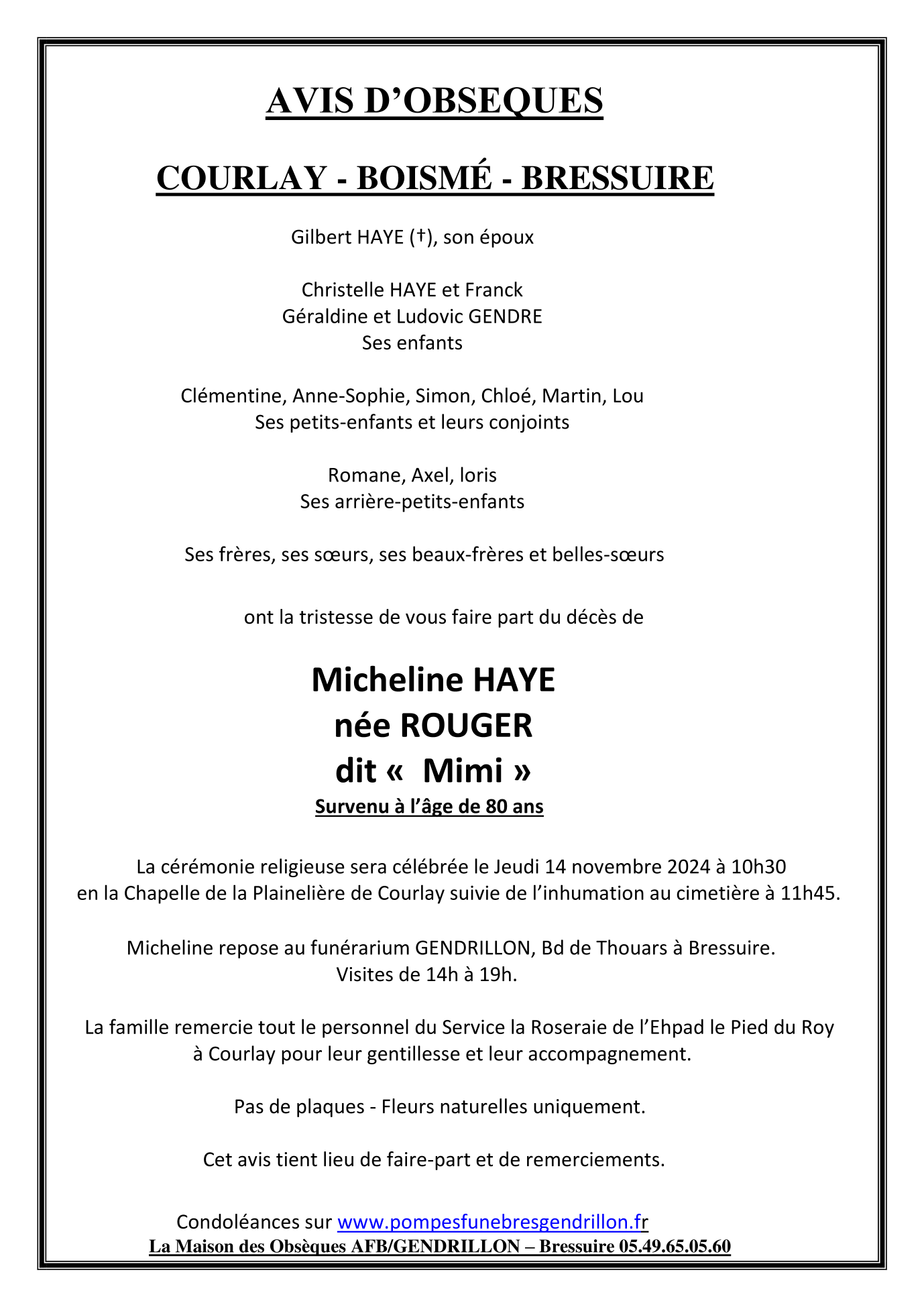 Cet espace « condoléances » est dédié à la mémoire de Madame Micheline HAYE née ROUGER.