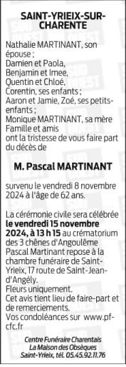 Cet espace « condoléances » est dédié à la mémoire de Monsieur Pascal MARTINANT.