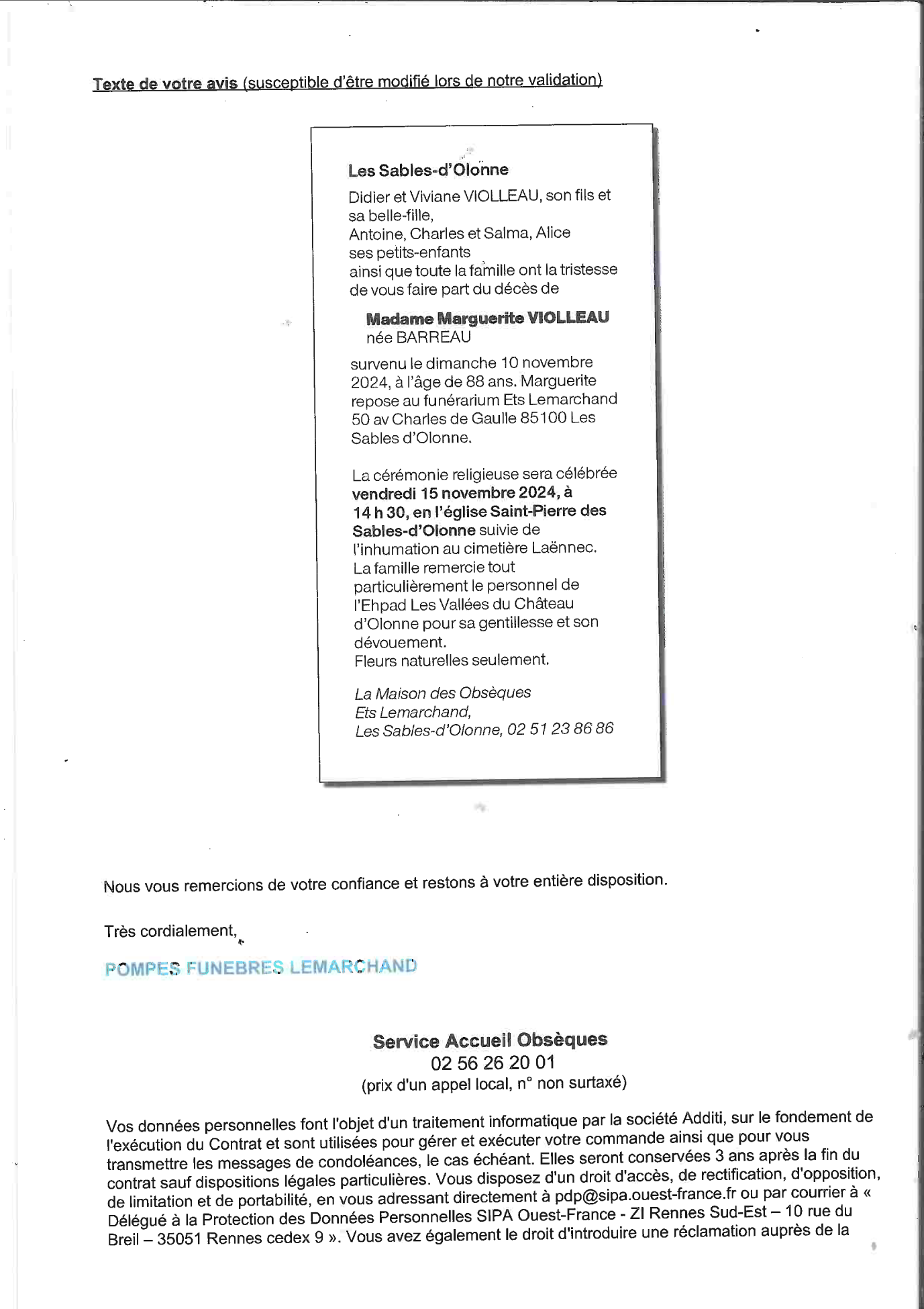 de Madame Marguerite VIOLLEAU née BARREAU