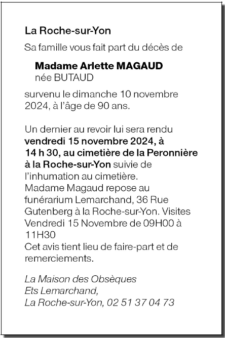 Cet espace « condoléances » est dédié à la mémoire de Madame Arlette MAGAUD née BUTAUD.