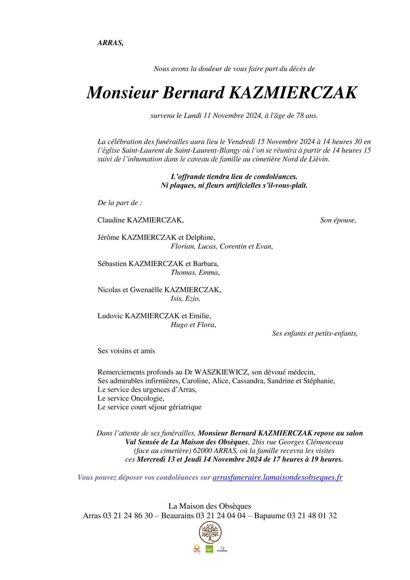 Cet espace « condoléances » est dédié à la mémoire de Monsieur Bernard KAZMIERCZAK.