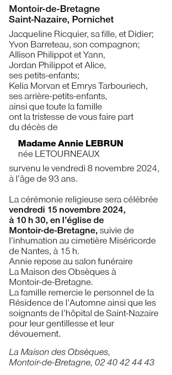 Cet espace « condoléances » est dédié à la mémoire de Madame Annie LEBRUN née LETOURNAUX.