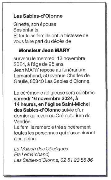 Cet espace « condoléances » est dédié à la mémoire de Monsieur Jean MARY.
