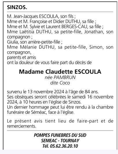 de Madame Claudette ESCOULA née PAMBRUN