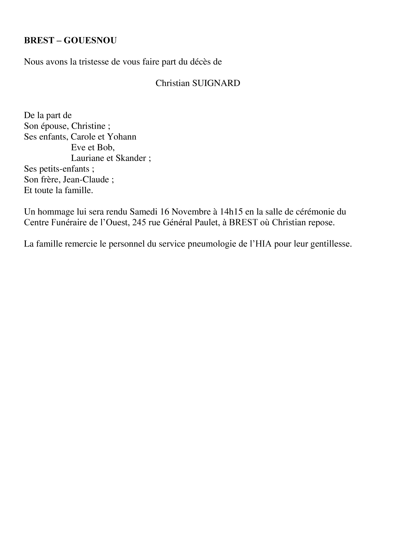 Décédé à Brest (29200) le mercredi 13 novembre 2024