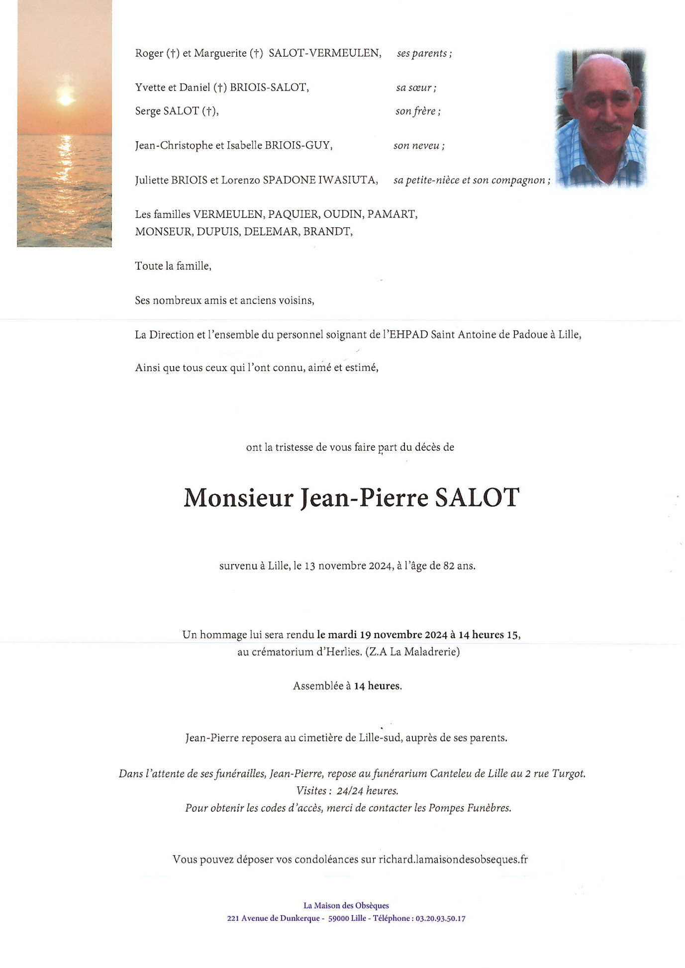 Cet espace « condoléances » est dédié à la mémoire de Monsieur Jean-Pierre SALOT.