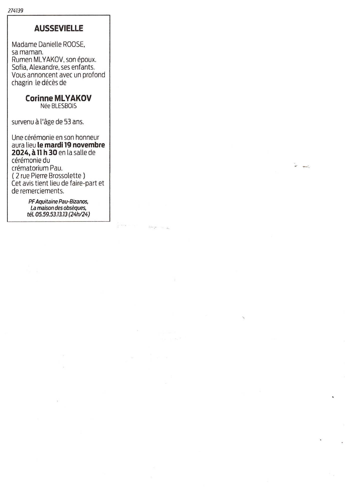 Cet espace « condoléances » est dédié à la mémoire de Madame Corinne MLYAKOV née BLESBOIS.
