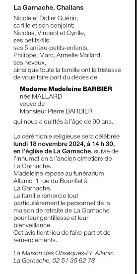 Cet espace « condoléances » est dédié à la mémoire de Madame Madeleine BARBIER née MALLARD.