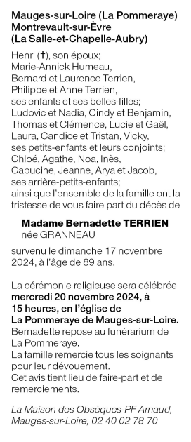 Cet espace « condoléances » est dédié à la mémoire de Madame Bernadette TERRIEN née GRANNEAU.