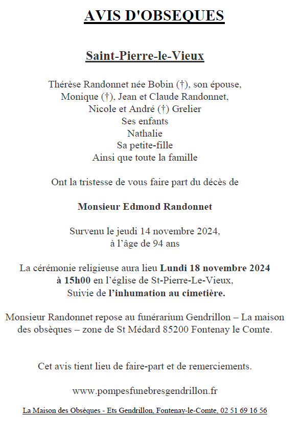 Décédé à Fontenay-le-Comte (85200) le jeudi 14 novembre 2024
