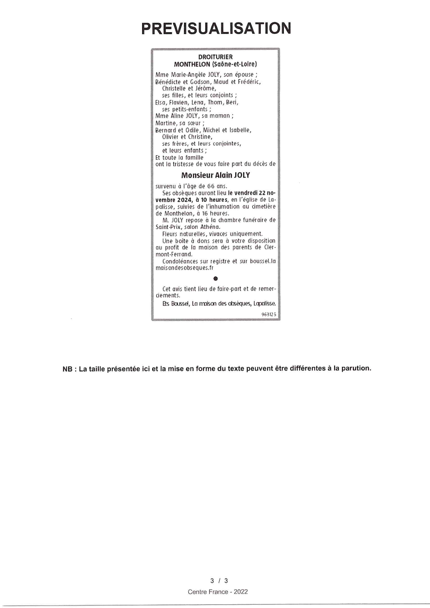 Cet espace « condoléances » est dédié à la mémoire de Monsieur Alain JOLY.