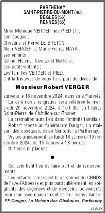 Cet espace « condoléances » est dédié à la mémoire de Monsieur Robert VERGER.