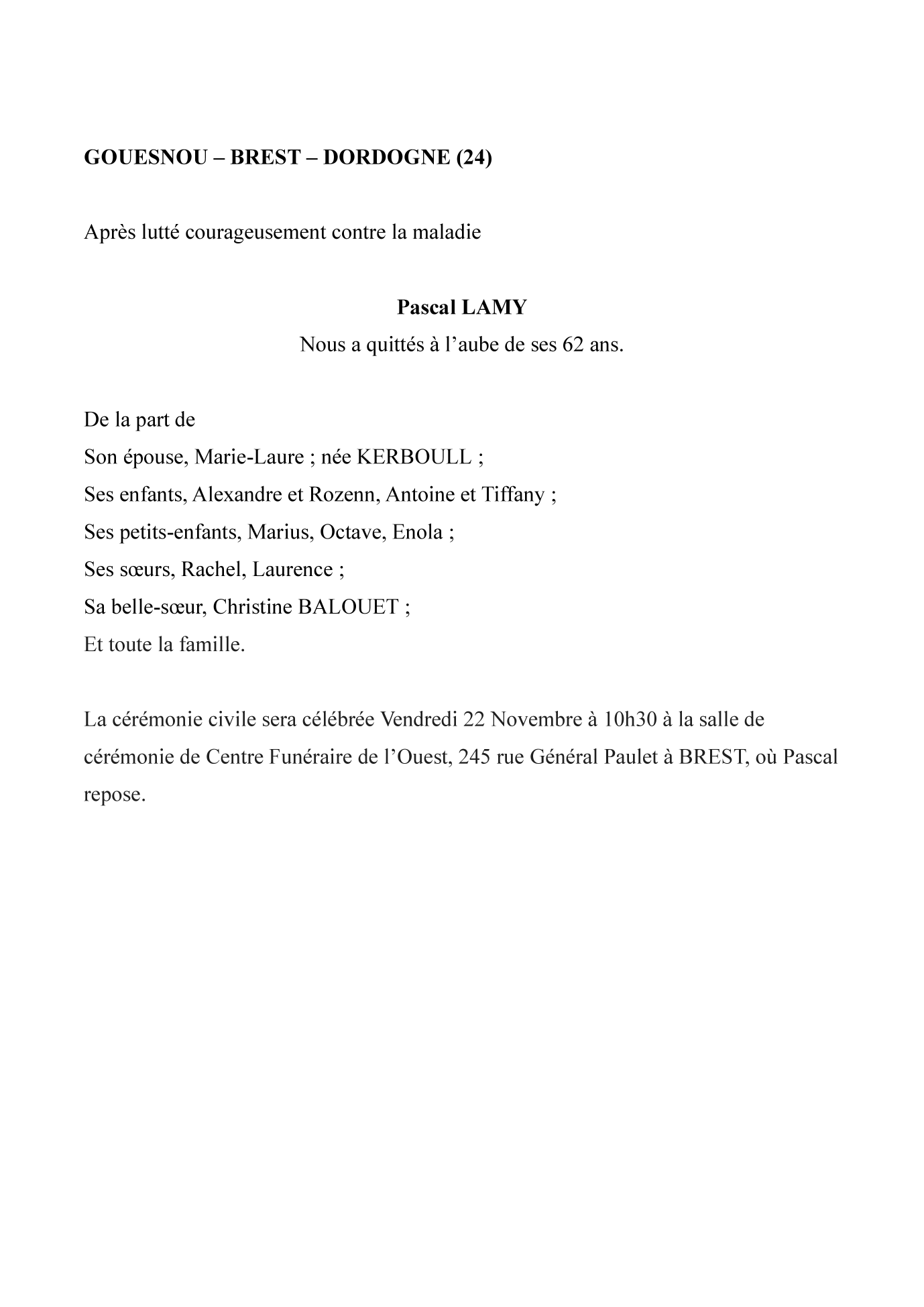 Cet espace « condoléances » est dédié à la mémoire de Monsieur Pascal LAMY.