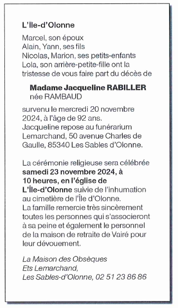 Cet espace « condoléances » est dédié à la mémoire de Madame Jacqueline RABILLER née RAMBAUD.