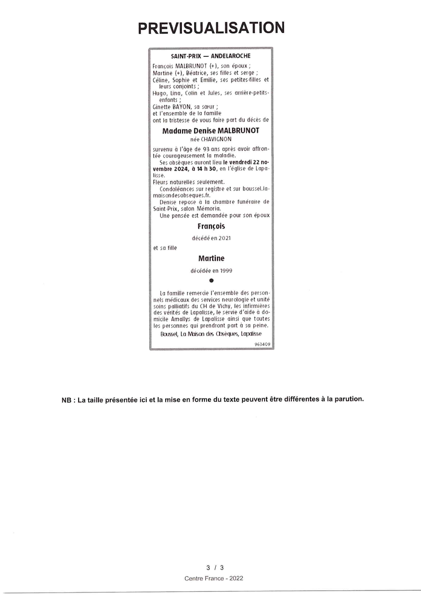 de Madame Denise MALBRUNOT née CHAVIGNON