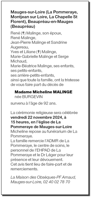 de Madame Micheline MALINGE née BURGEVIN