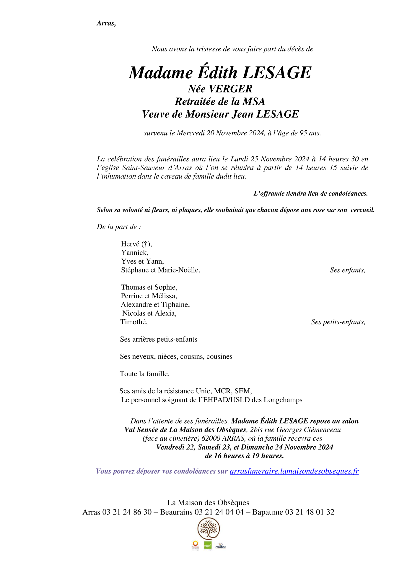 Cet espace « condoléances » est dédié à la mémoire de Madame Édith LESAGE née VERGER.