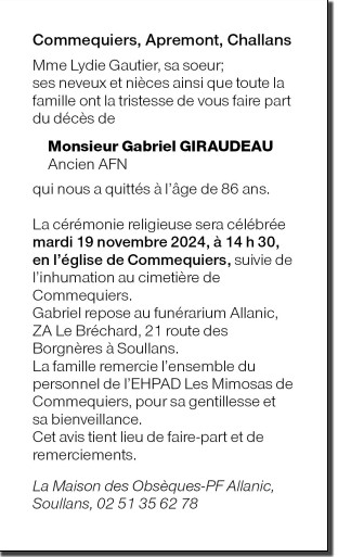 Cet espace « condoléances » est dédié à la mémoire de Monsieur Gabriel GIRAUDEAU.