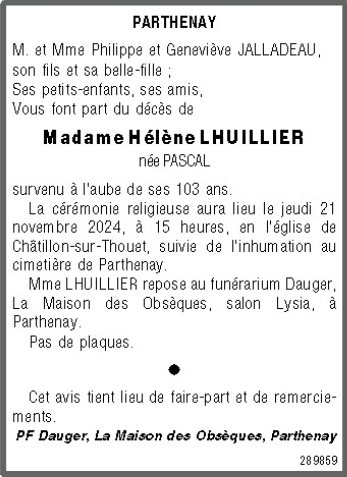 Cet espace « condoléances » est dédié à la mémoire de Madame Hélène LHUILLIER née PASCAL.