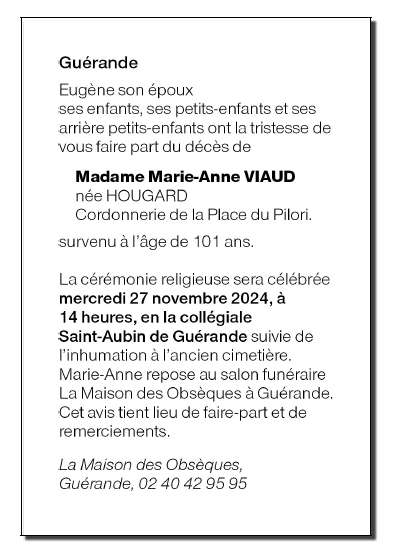 Cet espace « condoléances » est dédié à la mémoire de Madame Marie VIAUD née HOUGARD.