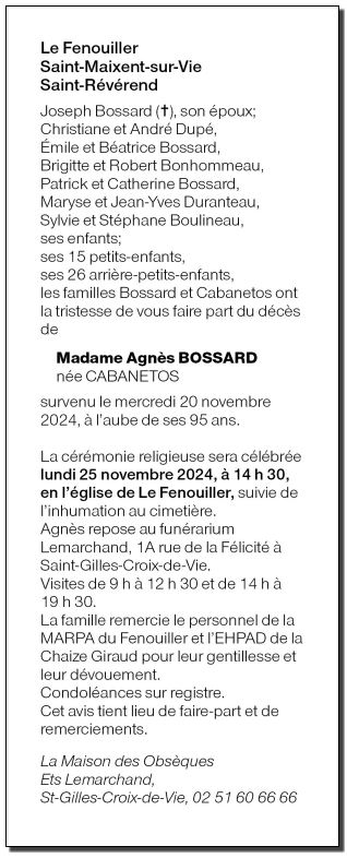 Cet espace « condoléances » est dédié à la mémoire de Madame Agnès BOSSARD née CABANETOS.