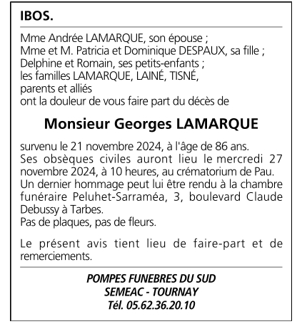 Cet espace « condoléances » est dédié à la mémoire de Monsieur Georges LAMARQUE.