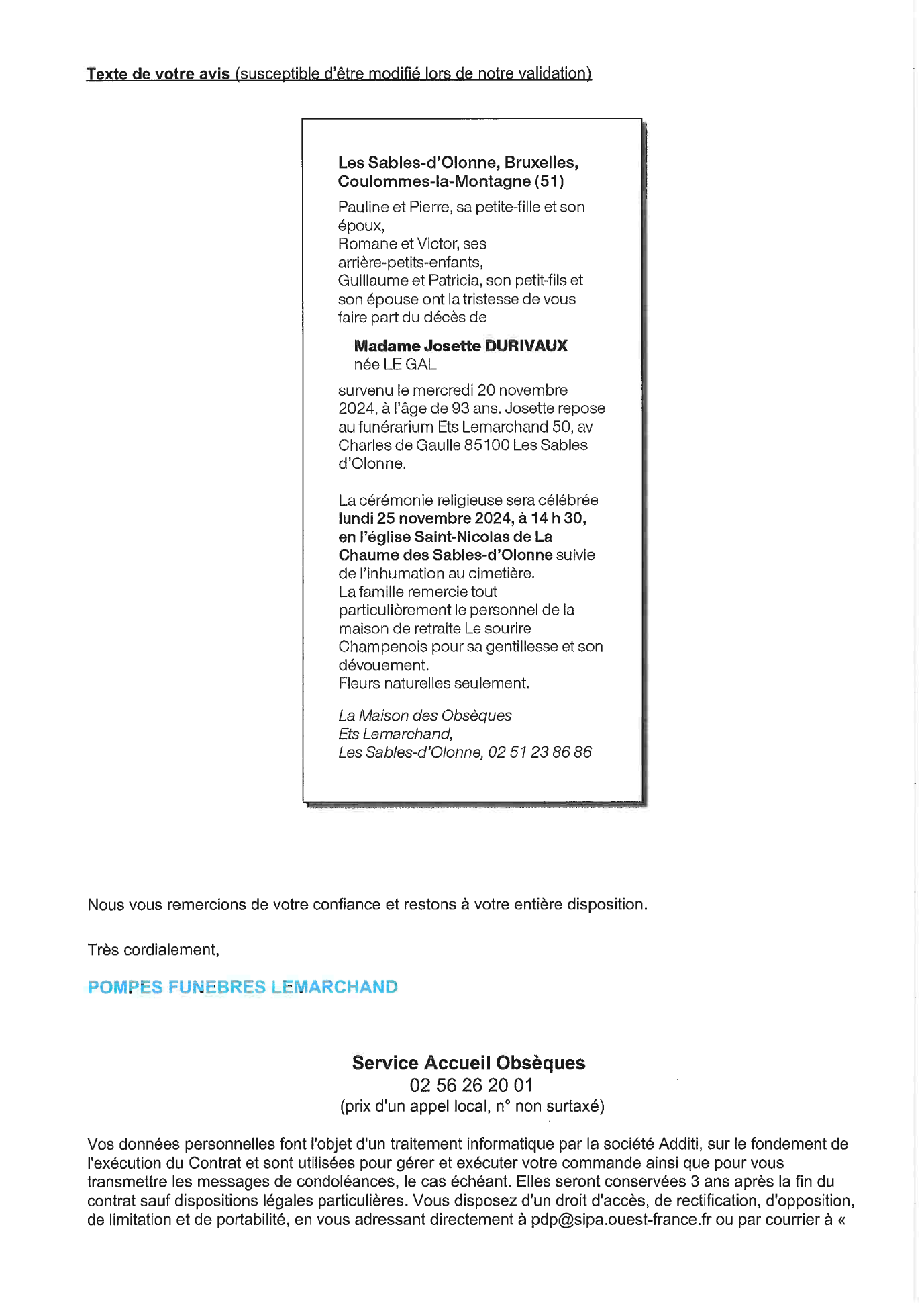 Cet espace « condoléances » est dédié à la mémoire de Madame Josette DURIVAUX née LE GAL.