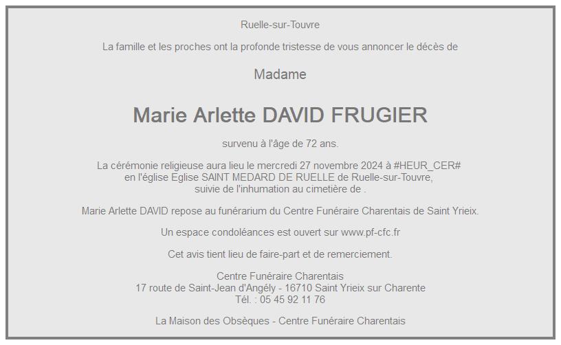 Cet espace « condoléances » est dédié à la mémoire de Madame Marie Arlette DAVID née FRUGIER.