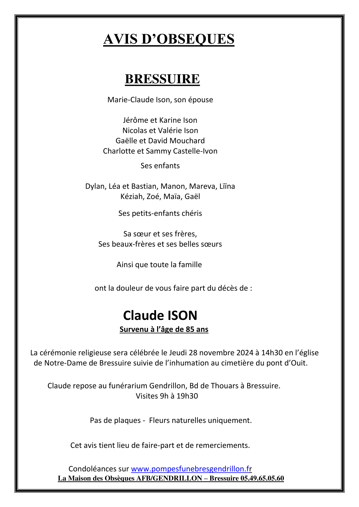 Cet espace « condoléances » est dédié à la mémoire de Monsieur Claude ISON.